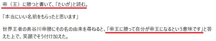 強い名前がいいという父親の想い、そして「帝王に勝ち自分が帝王になる」という意味をこめられているとのことで、長谷川帝勝選手の現在の活躍ぶりにぴったりな名前ですよね!
