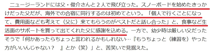 両親ともにスノーボードが趣味とのことですが、特に父親が専属コーチ並に長谷川帝勝選手の練習に付き合っているんだそう。