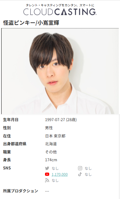 過去には事務所に所属していましたが現在は、怪盗ピンキー/小嶌宣輝さんはクラウドキャスティングに登録して活動しているようです。