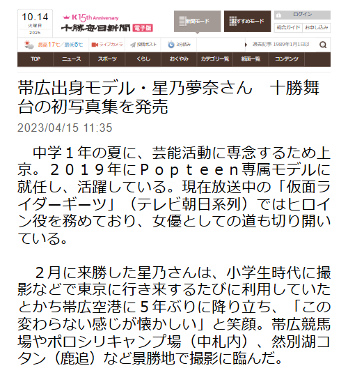 帯広市立大空小学校(現・帯広市立大空学園義務教育学校)を卒業したあと、中学1年生の夏に星乃夢奈さんは芸能活動に専念するために上京。