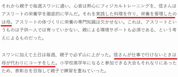 近藤心音選手がオリンピックを目指すと決めてからは、母親が栄養管理でサポート、スキーのコーチも担っていました。