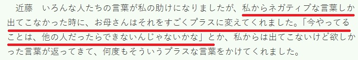 北京オリンピックで怪我をし、手術、過酷なリハビリと大変な時期を過ごした近藤心音選手ですが、母親の言葉で救われたとのこと。
