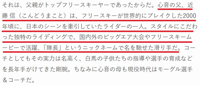 ・近藤心音選手の父親は信さんと言い、フリースタイルスキーの第一人者で、スキーを始めるきっかけを与えてくれました。