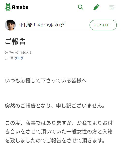 中村蒼さんは、2017年1月21日に一般女性との結婚を発表しました。