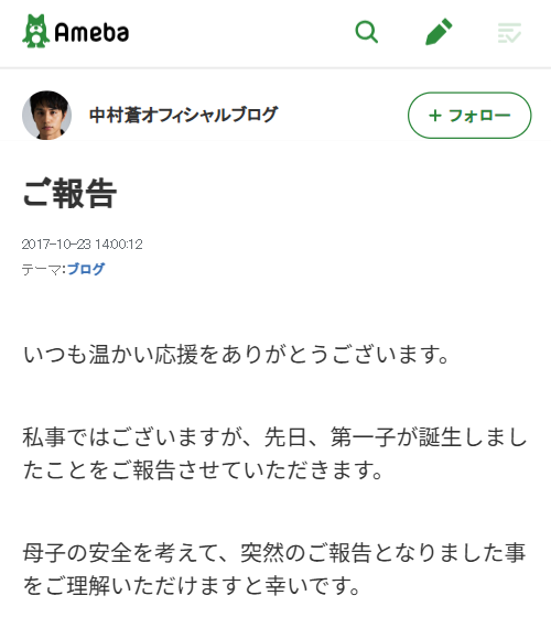中村蒼さんの第一子誕生の報告記事。