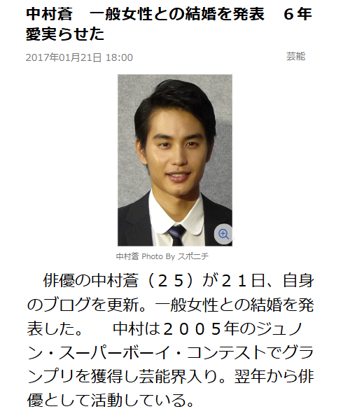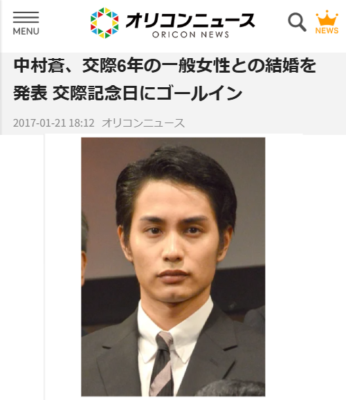 中村蒼さんは、2017年1月21日に一般女性との結婚を発表しました。