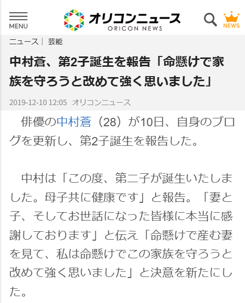 中村蒼さんの第二子誕生のネットニュース記事。