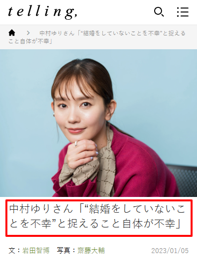 2023年1月5日掲載の「telling,(テリング)」のインタビューでは「恋愛観などは年齢を重ねて変わりましたか?」と質問を受けて中村ゆりさん、「この先に年を重ねて生活的余裕ができたら」と仕事の優先の考え方が変わるかもしれないと答えています。