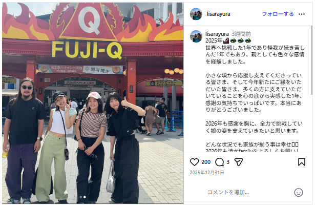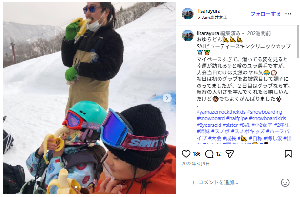 さらさんと妹ゆらさんは、スノーボードスタイルでの家族写真がいくつか見られます