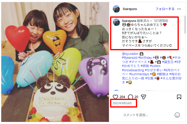 2022年6月24日の誕生日を祝う投稿の中で「9才」といった年齢表記が確認でき、その年齢を逆算すると2013年生まれと一致します。