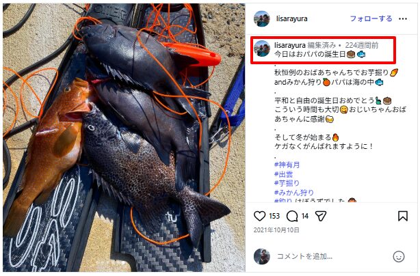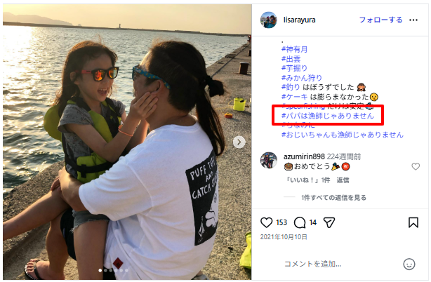 10月10日は「パパの誕生日」ということでMAMAアカウント(運用)のインスタのほうに2021年、父親の釣りについて「パパは漁師じゃありません」とわざわざハッシュタグが付けられていました。