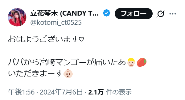 他には、「パパから宮崎マンゴーが届いたあ」という立花琴未さんのX投稿もありました。