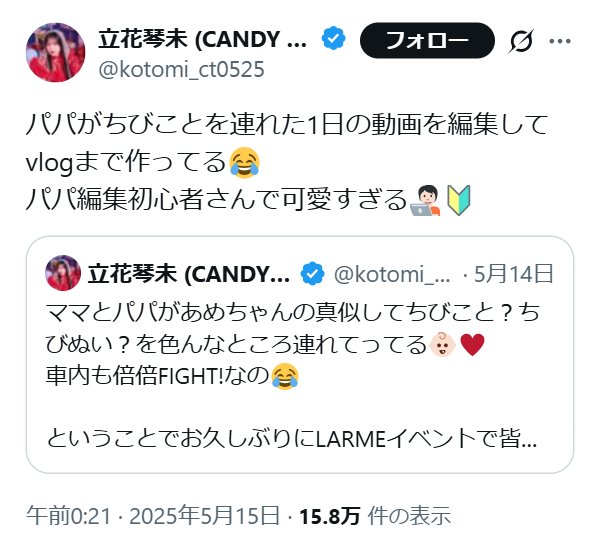 Xのほうでは2025年5月15日に、お父さんが動画を編集して「ちびこと」(幼少期の立花琴未さん)のvlogを作っているという投稿をしていました。