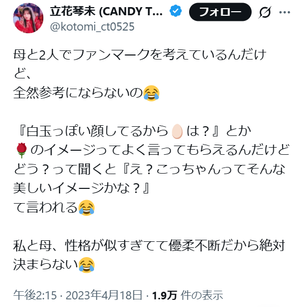 一緒に「ファンマーク」を考案しようとしたらしくて、なかなか決まらない状況に、「私と母、性格が似すぎてて優柔不断だから…」と立花琴未さんはX投稿で泣き顔の絵文字で報告していました。