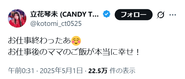 2025年5月1日に「お仕事後のママのご飯」と書いているので、この日は「母親と立花琴未さん」が同じ家にいることは確実ですよね。
