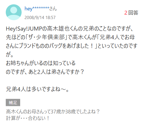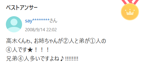 高木雄也さんの家族構成については公式ソース(一次情報)は見つかりませんが、ファンが記憶しているところでは、父親、母親、姉が2人、高木雄也さん本人、弟の6人家族だそうです。