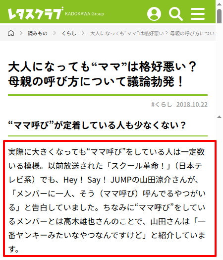 高木雄也さんのママ呼びは芸能ニュースサイトではなく、生活の知恵を扱っている「レタスクラブ」の記事で取り上げられていたこともあります。