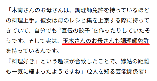 見出しは「料理プロ並みで嫁姑円満に」となっており、記事には木南晴夏さんの母親も玉木宏さんの母親も調理師免許を持っている情報も差し込まれています。