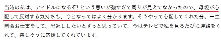 渡邉美穂さんの母親はアイドルになることを反対していたそうですが、芸能界に入るとなったときには「自分を見失わないように」との言葉をかけてくれたんだそう。